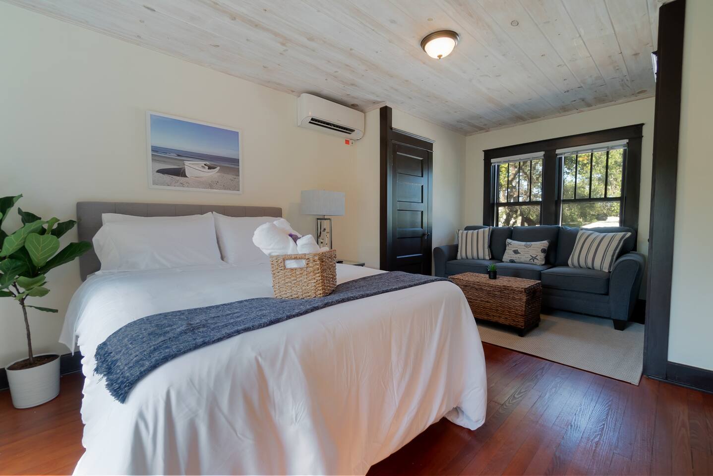 This spacious and private complex consists of two cottages and a 3 unit apartment building, built in the 1920's and renovated to modern day coastal charm. Outside you will find multiple sitting and dining areas with shade umbrellas, two barbecue grills, a cozy fireplace and a hammock. In our laundry area please help yourself to beach chairs and outdoor games. ** Petunia** 2 Queen Bedrooms & 1 Bathroom- Sleeps 4 ** Dahlia** 2 Queen Bedrooms, 1 extra room with 2 futon beds & 1 Bathroom- Sleeps 6 ** Apartment 1** Upstairs Unit-1 Queen Bedroom & 1 Bathroom- Sleeps 2 ** Apartment 2** Upstairs Unit- 1 Queen Bed, 1 full size pull-out couch & 1 Bathroom- Sleeps 4 ** Apartment 3** Ground Floor- 1 Queen Bed, 1 futon bed & 1 Bathroom- Sleeps 3 PLEASE NOTE- Futon Beds and pull-out couches may be more suitable for children or young adults. The space in Apartment 2 is tight with the bed plus pull-out open and four adults may be uncomfortable, but a family of 4 would work well. We also have a pack and play available. ** All units have full kitchens **