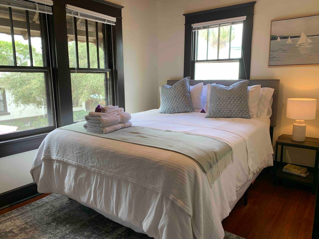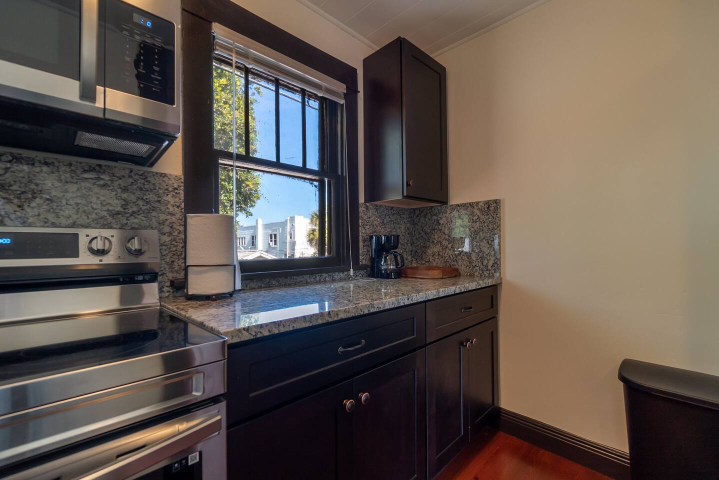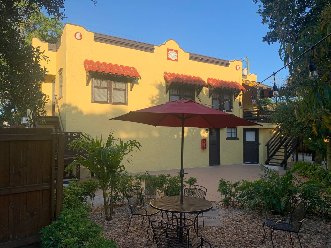This apartment is located on the second floor of our newly renovated 1920’s historic building. Although fully updated, we took careful thought when preserving the space's unique charm from the original hard wood floors to the beautiful cast iron claw-foot tub. Enjoy a fully stocked kitchen ready for some "home cooked" meals. In the morning enjoy a complimentary coffee and in the evening after exploring the town, curl up in front of our smart tv to catch up on your shows. This unit looks out amongst the trees over the shared courtyard where you may enjoy many sitting areas, patio tables, two gas grills, a hammock under the oak tree and a fire pit. Beach essentials are provided on a first come first serve basis in the laundry area which is free for guest use during your stay.