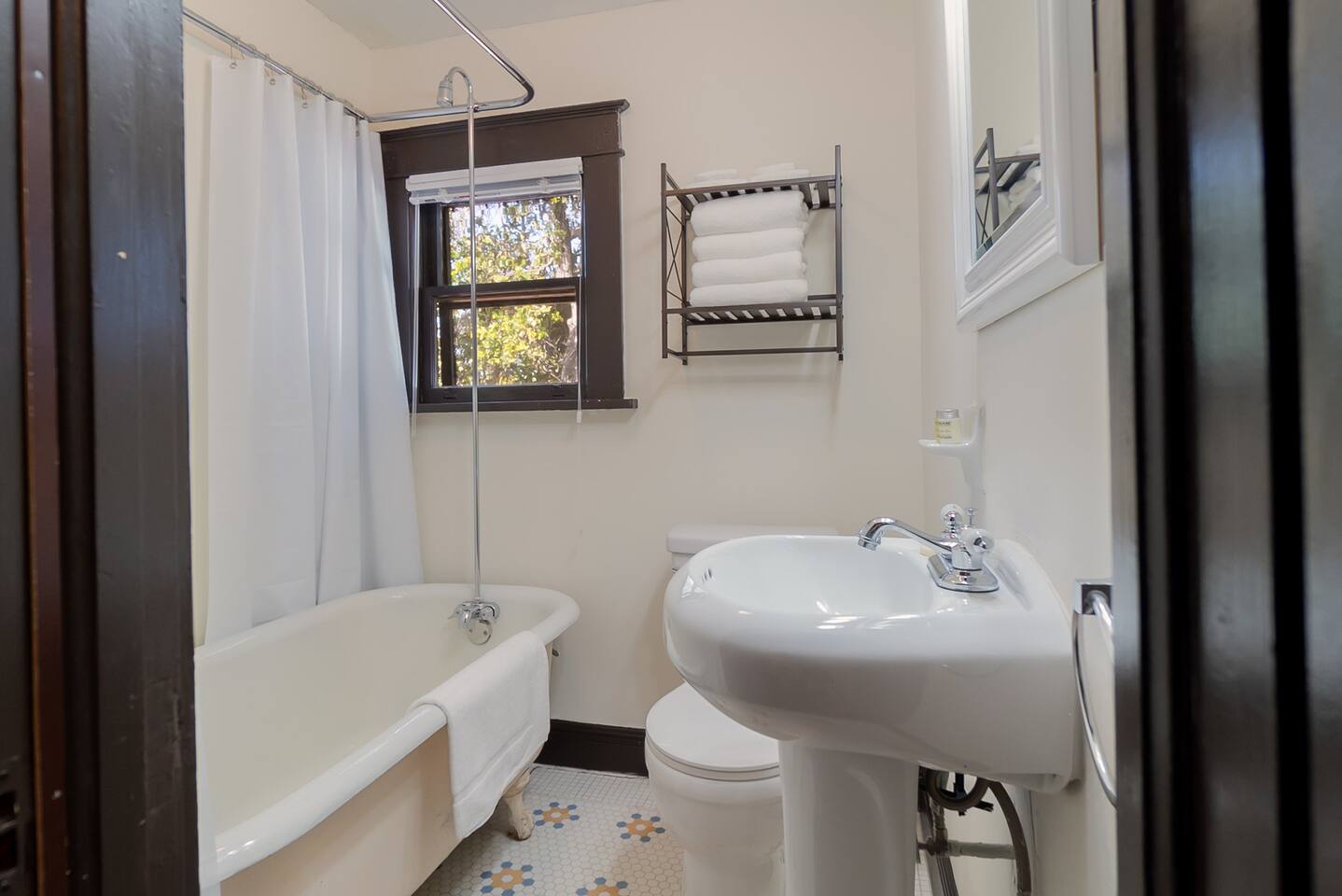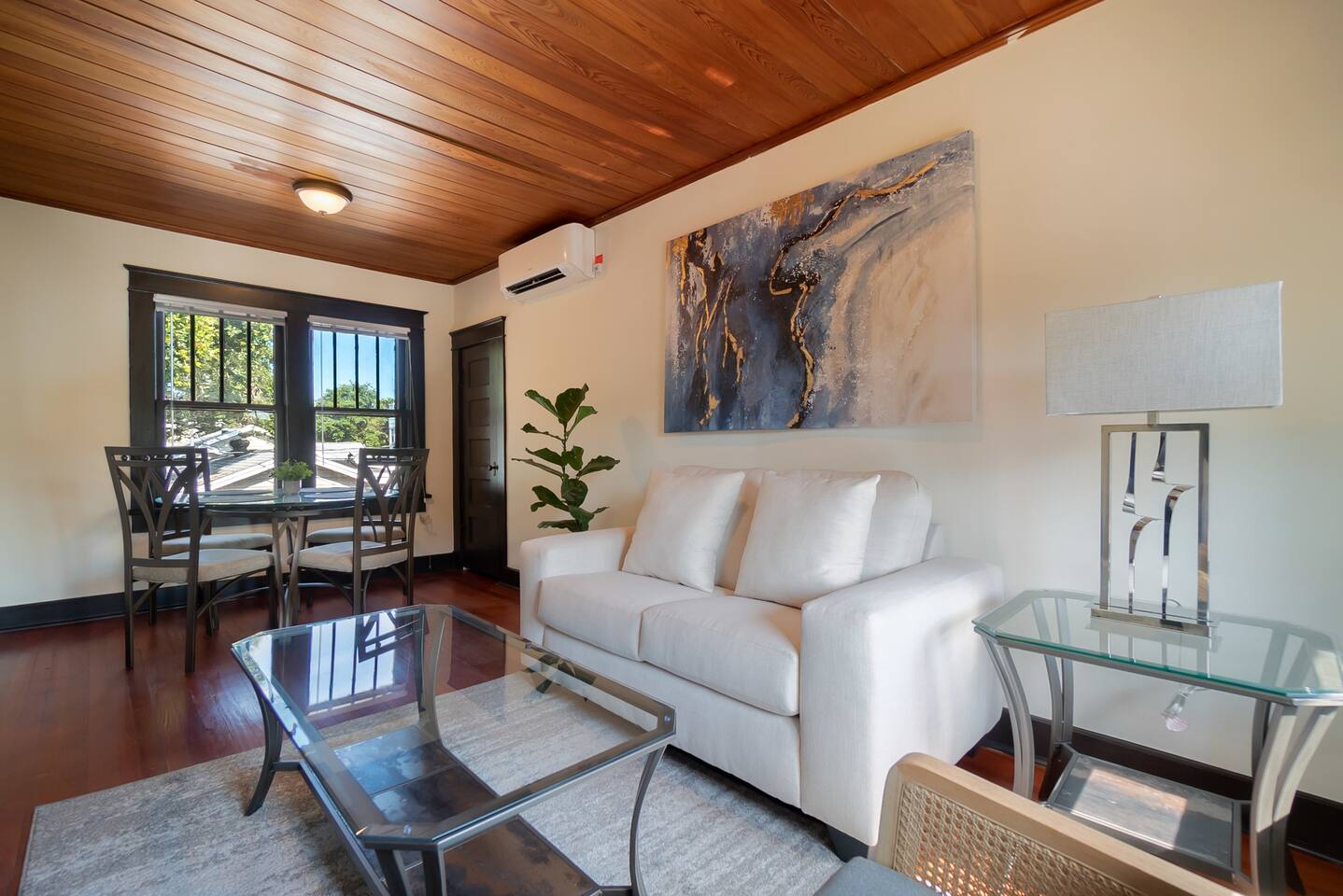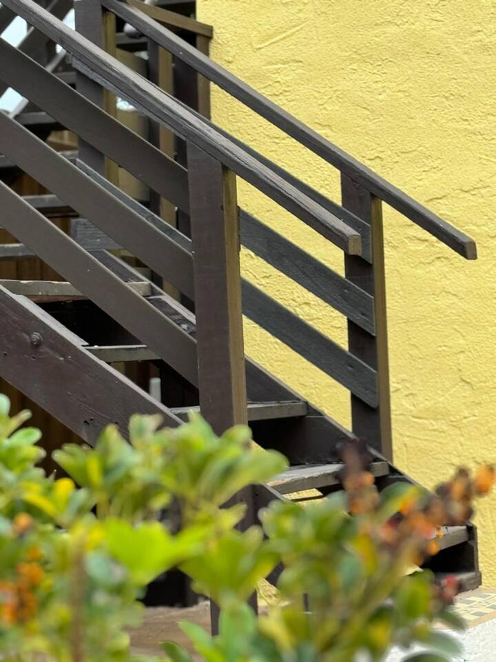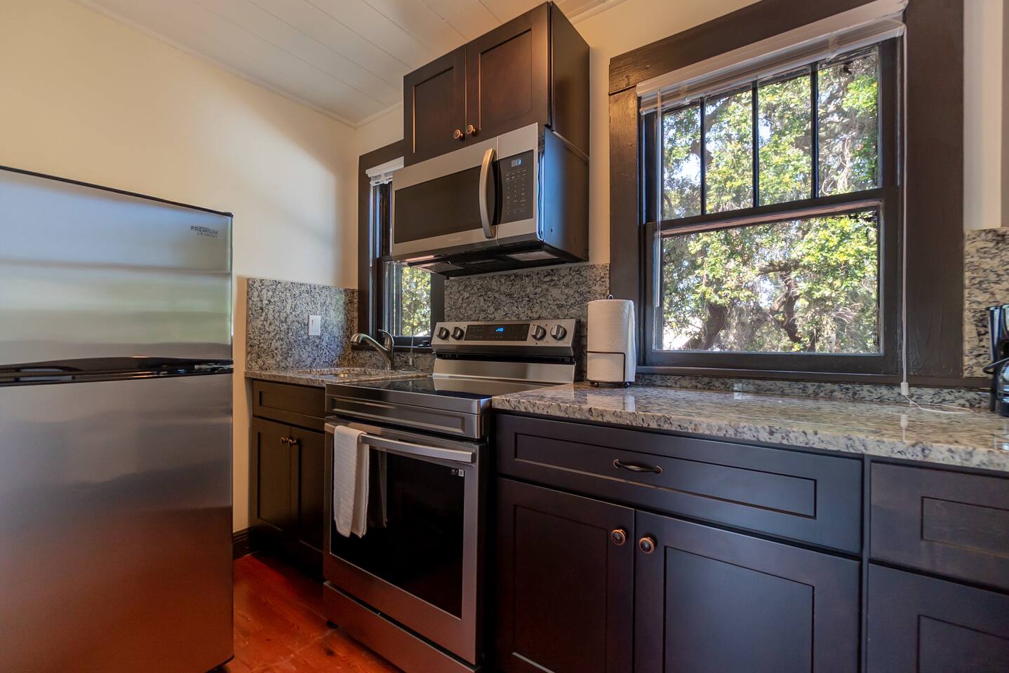 This apartment is located on the second floor of our newly renovated 1920’s historic building. Although fully updated, we took careful thought when preserving the space's unique charm from the original hard wood floors to the beautiful cast iron claw-foot tub. Enjoy a fully stocked kitchen ready for some "home cooked" meals. In the morning enjoy a complimentary coffee and in the evening after exploring the town, curl up in front of our smart tv to catch up on your shows. This unit looks out amongst the trees over the shared courtyard where you may enjoy many sitting areas, patio tables, two gas grills, a hammock under the oak tree and a fire pit. Beach essentials are provided on a first come first serve basis in the laundry area which is free for guest use during your stay.
