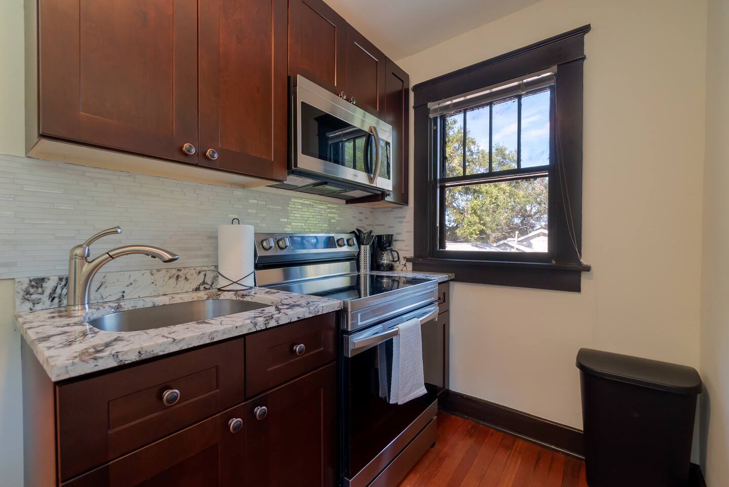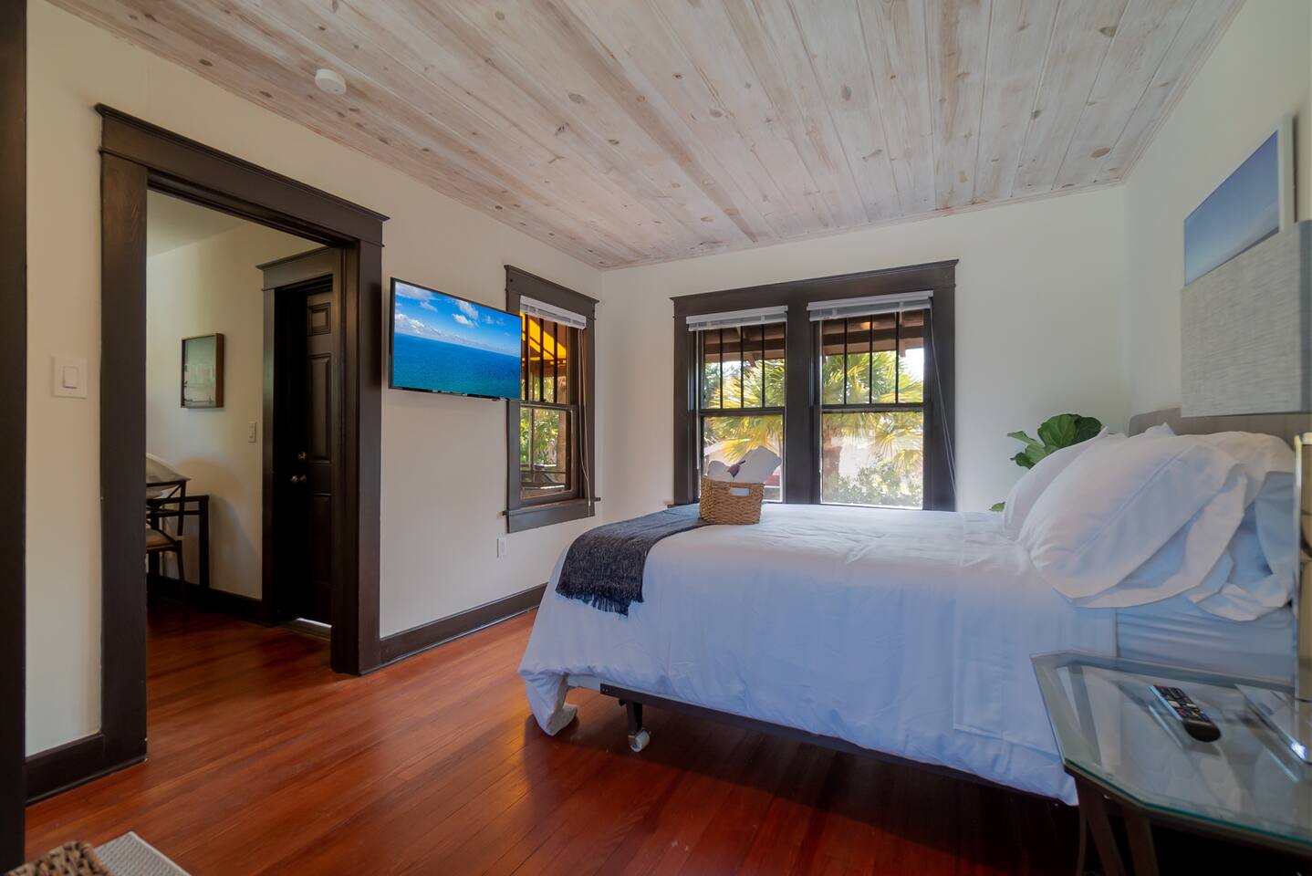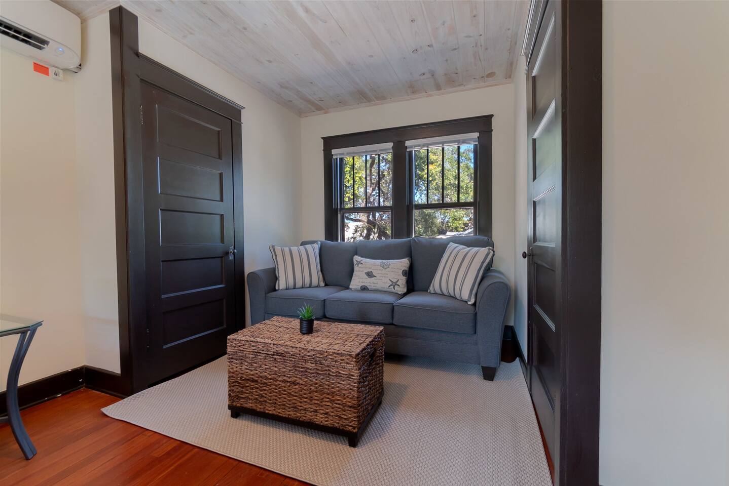 This unit is located on the second floor of our newly renovated 1920’s historic building and can accommodate four guests- Two in the queen sized bed and two on the pull-out couch. Some may find it to be a tight fit for four adults, however adults traveling with children or young adults can appreciate the close quarters. Although renovated, we took careful thought when preserving the space's unique charm from the original hard wood floors to the beautiful cast iron claw-foot tub. Enjoy a fully stocked kitchen ready for some "home cooked" meals. In the morning enjoy a complimentary coffee on the front porch and in the evening after exploring the town, curl up in front of our smart tv to catch up on your shows. This unit has its own private balcony that looks out amongst the trees over the shared courtyard where you may enjoy many sitting areas, patio tables, two gas grills, a hammock under the oak tree and a fire pit. Bicycles and beach essentials are provided on a first come first serve basis in the laundry area which is free for guest use during your stay.