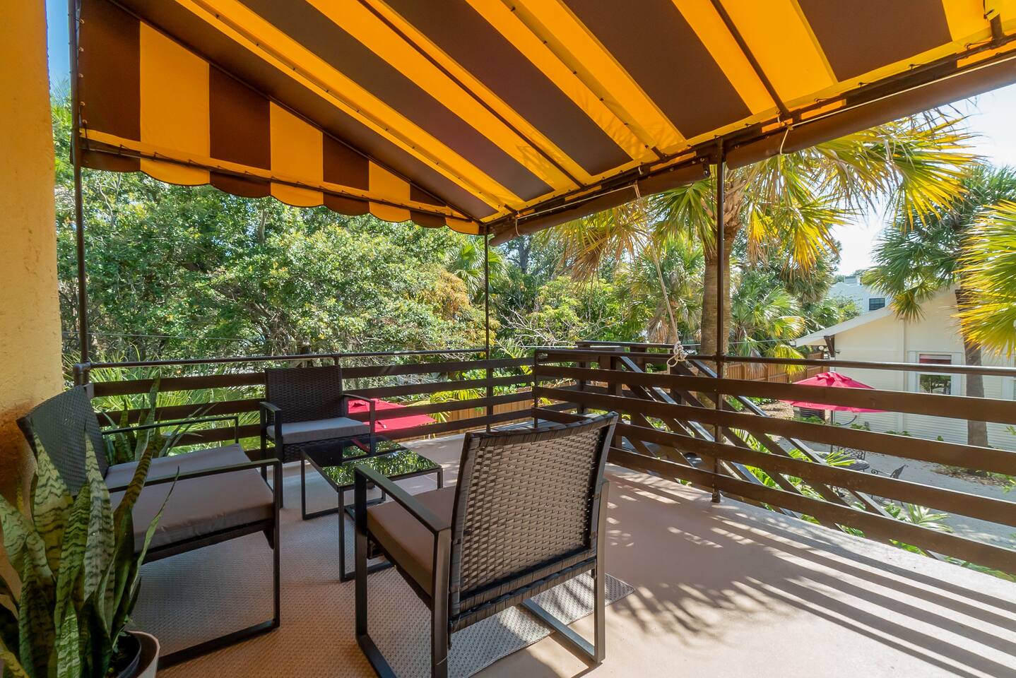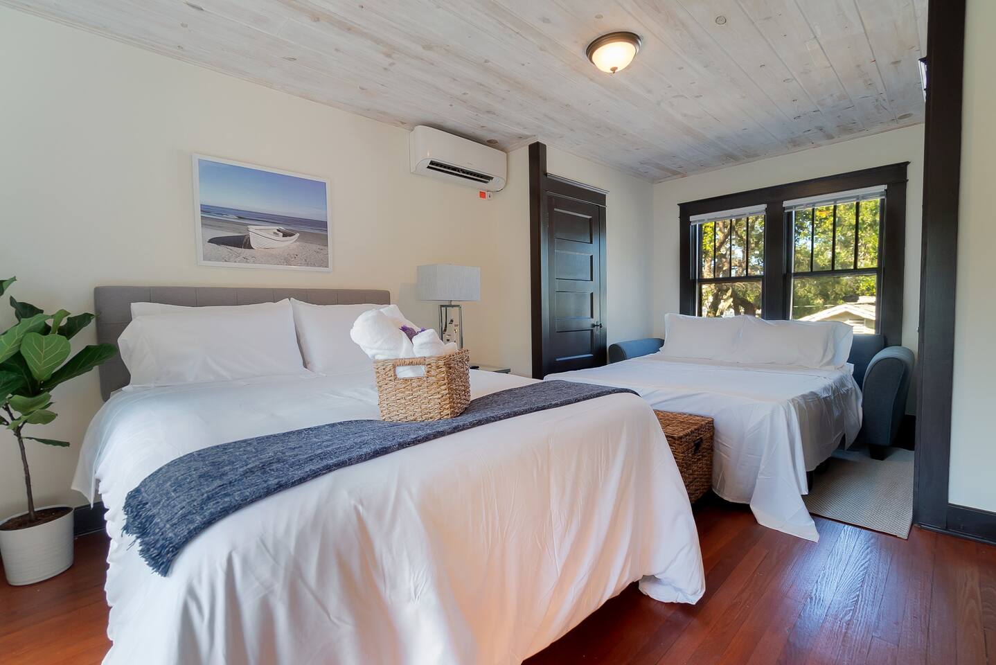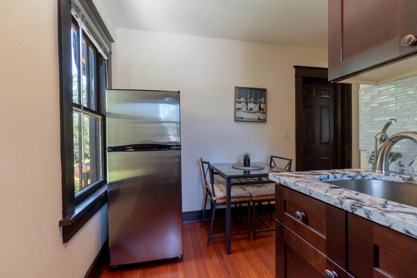 This unit is located on the second floor of our newly renovated 1920’s historic building and can accommodate four guests- Two in the queen sized bed and two on the pull-out couch. Some may find it to be a tight fit for four adults, however adults traveling with children or young adults can appreciate the close quarters. Although renovated, we took careful thought when preserving the space's unique charm from the original hard wood floors to the beautiful cast iron claw-foot tub. Enjoy a fully stocked kitchen ready for some "home cooked" meals. In the morning enjoy a complimentary coffee on the front porch and in the evening after exploring the town, curl up in front of our smart tv to catch up on your shows. This unit has its own private balcony that looks out amongst the trees over the shared courtyard where you may enjoy many sitting areas, patio tables, two gas grills, a hammock under the oak tree and a fire pit. Bicycles and beach essentials are provided on a first come first serve basis in the laundry area which is free for guest use during your stay.